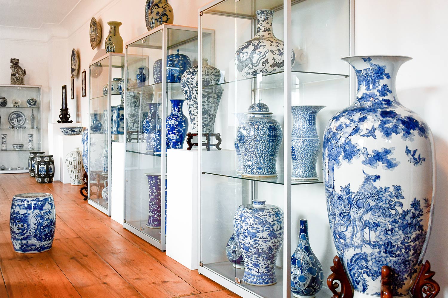 Innerhalb der historischen Ordnung sind die Gegenstände in den einzelnen Räumen nach dem Material ausgestellt: Bronze religiös (Buddha-Figuren), Holz religiös, Holz profan, Bronze profan, Jade, Elfenbein und Bergkristall, kaiserliche Amtskleider, Email, Porzellan bunt, weiß und schwarz, blau-weiß, einfärbig grün, rot, blau und gelb.