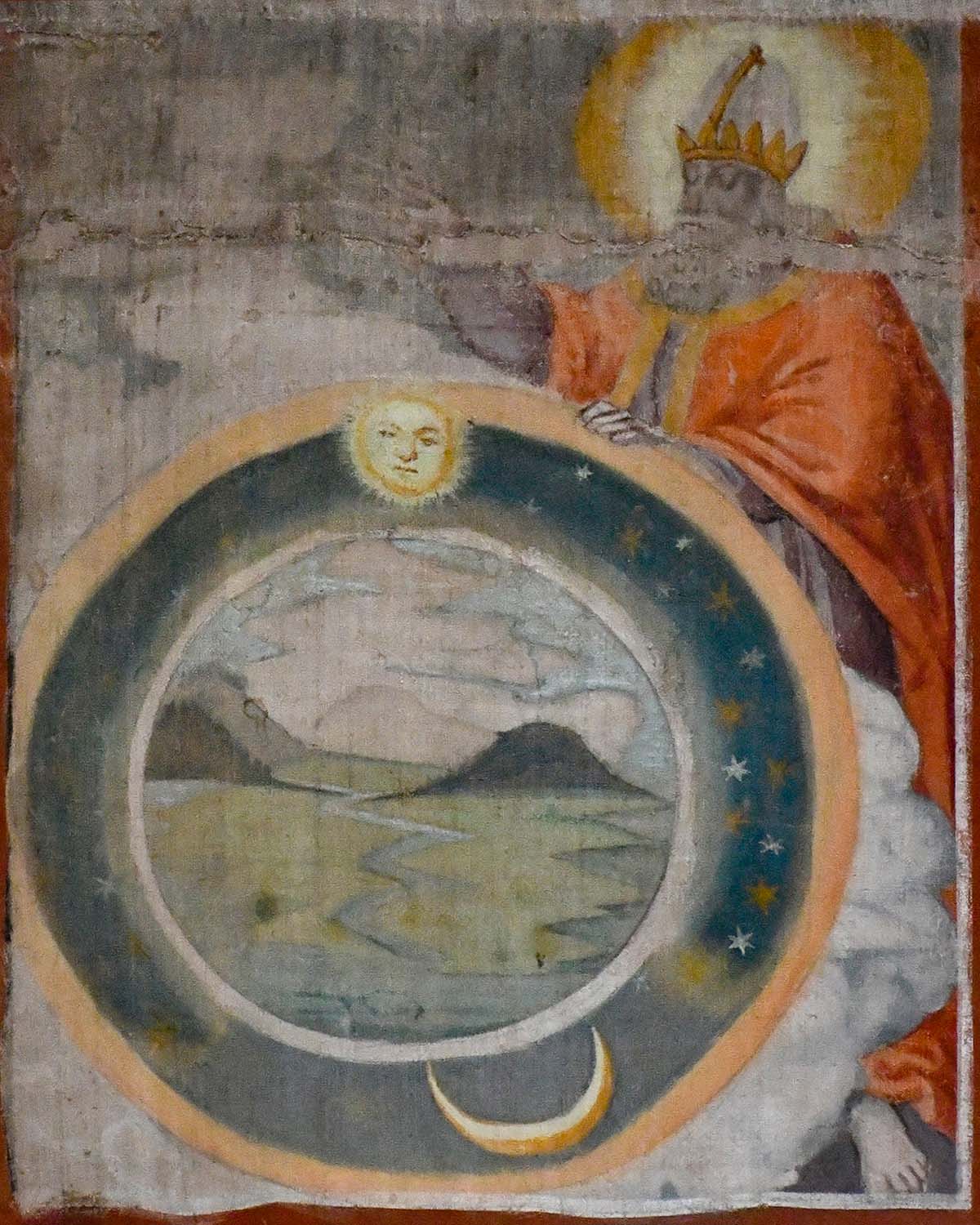 Im Zentrum steht Gottvater, dargestellt als hoheitsvolle Figur mit Krone und rotem Mantel, der schützend seine Hände an den Weltenkreis legt. Innerhalb dieses Kreises ist eine stilisierte Landschaft mit Bergen und Gewässern erkennbar, während die Randzone von Sonne, Mond und Sternen gesäumt wird.