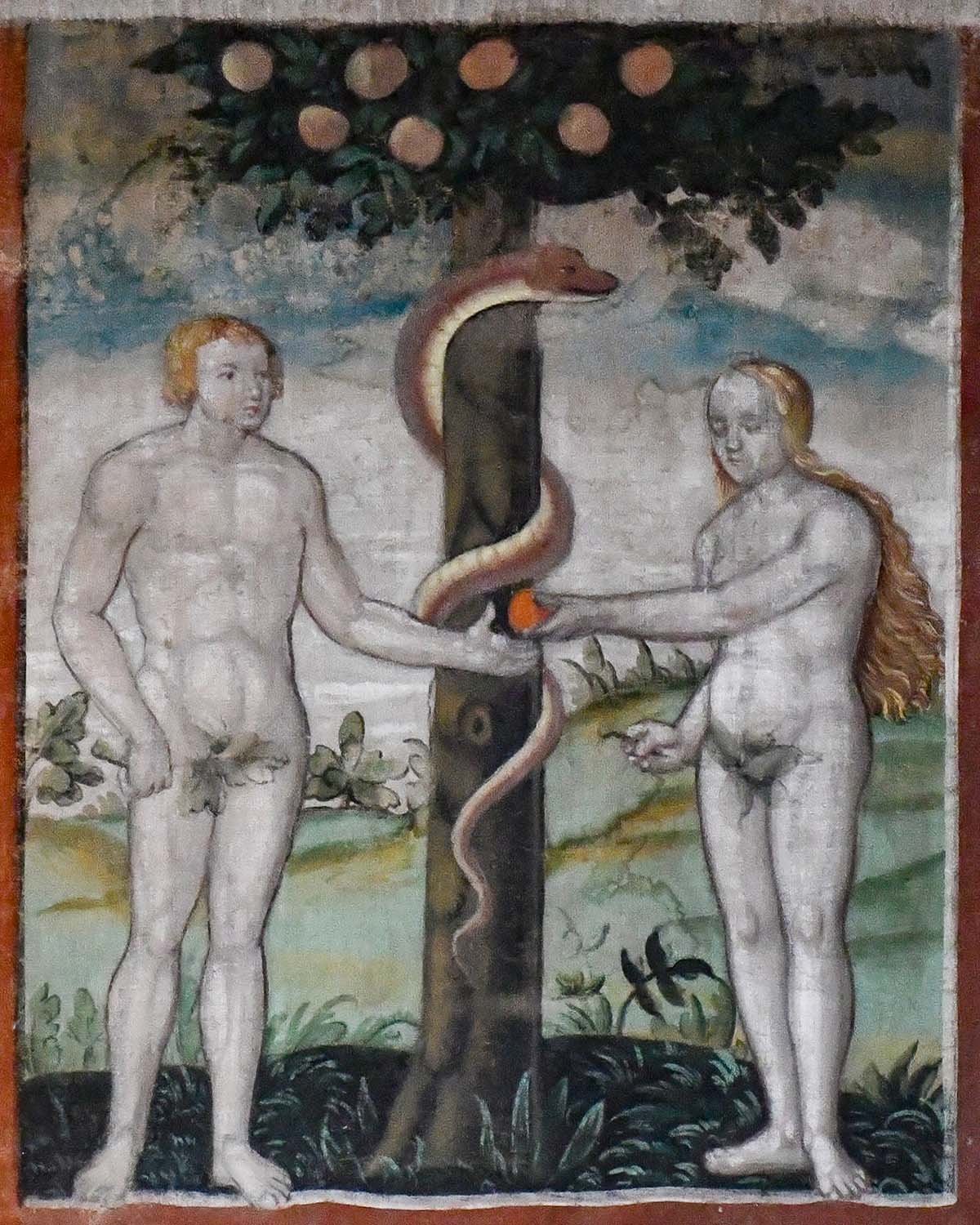 In der Mitte des Feldes steht der Baum der Erkenntnis, um dessen Stamm sich die Schlange windet und Eva die verbotene Frucht reicht. Adam und Eva flankieren den Baum in einer weiten Hügellandschaft und sind bereits mit Blättern bekleidet, was den Moment des Sündenfalls unmittelbar illustriert. Diese Darstellung folgt chronologisch auf die Erschaffung von Mensch und Welt und leitet die Erzählung von Schuld und späterer Erlösung ein.