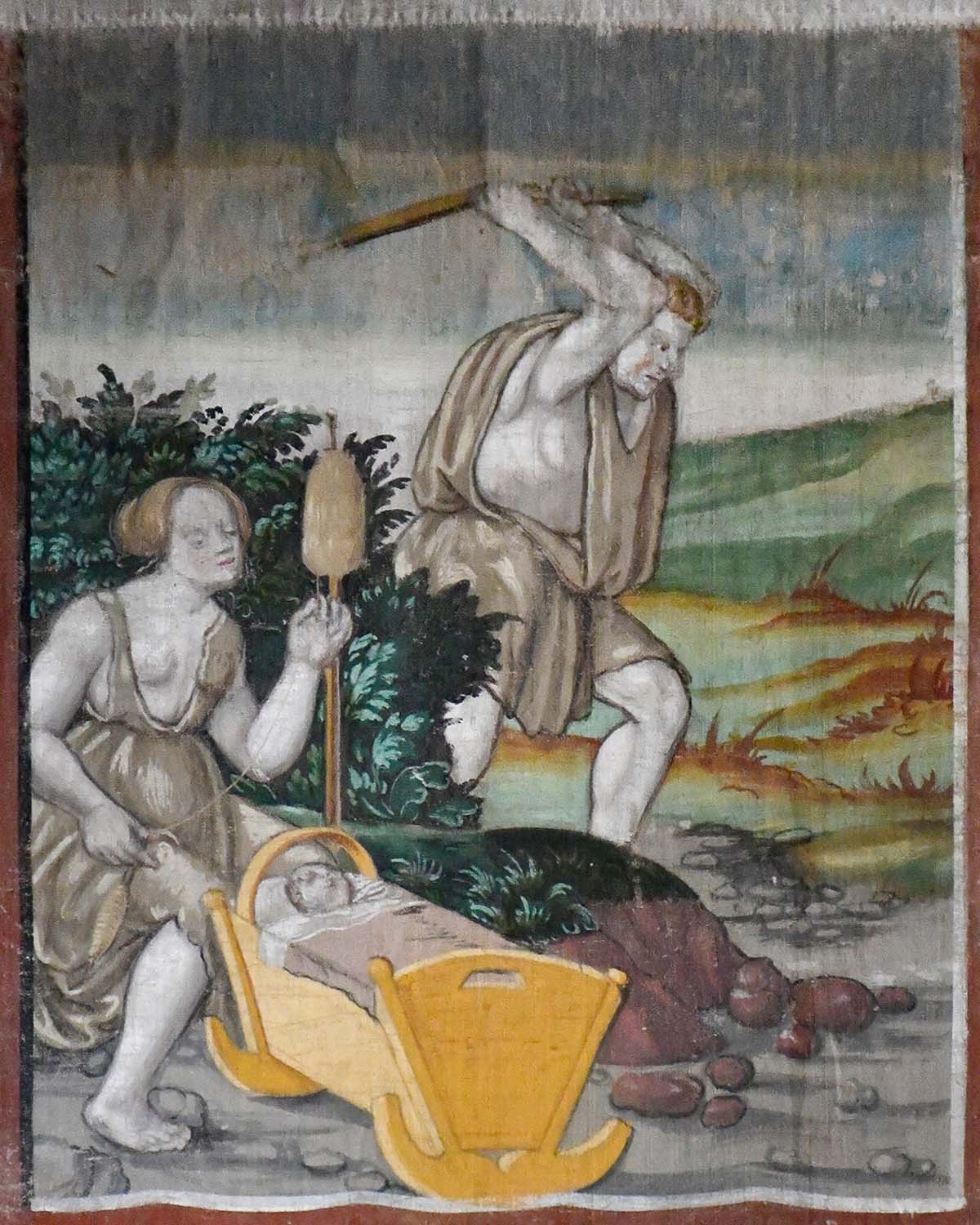 Eine Darstellung des mühsamen Lebens der ersten Menschenfamilie nach der Vertreibung aus dem Paradies. Links im Vordergrund sitzt Eva, die mit Rocken und Spindel Wolle spinnt, während vor ihr ein Säugling in einer gelben Wiege liegt. Im rechten Hintergrund vollzieht sich die zentrale Gewalttat: Kain erschlägt seinen Bruder Abel mit einer hölzernen Keule. Diese Szene zeigt den Fortgang der biblischen Geschichte und das zerstörerische Eindringen der Sünde in die Welt unmittelbar nach dem Sündenfall.