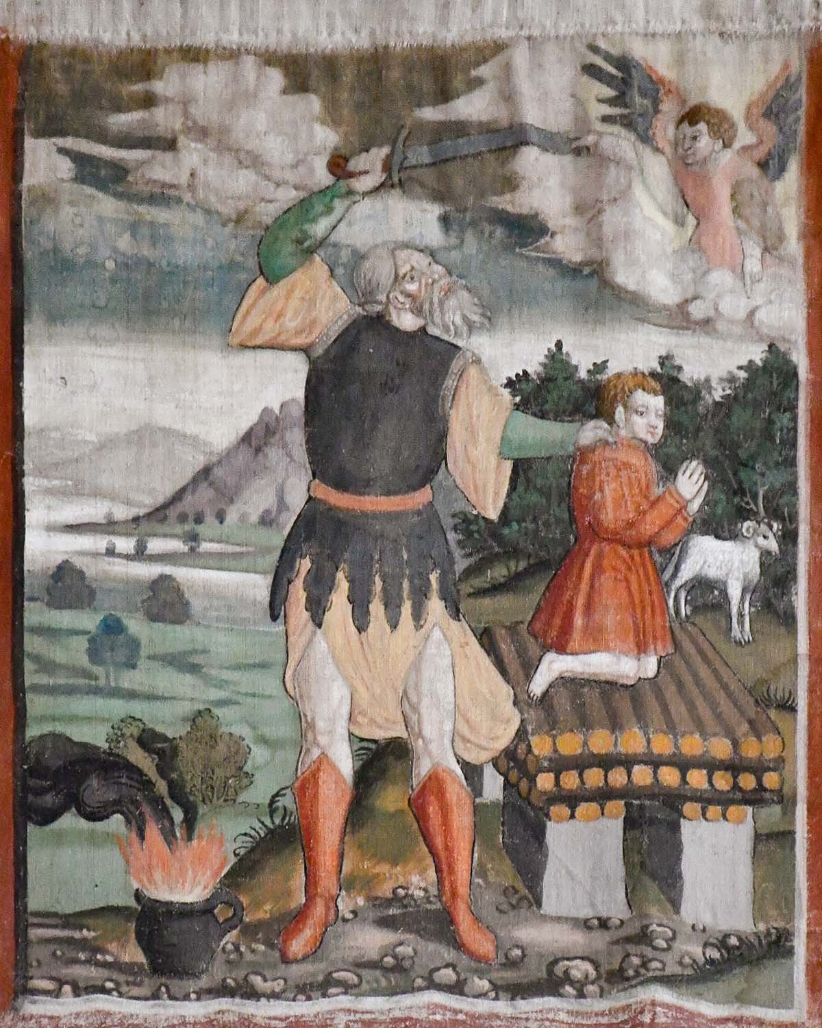 Im Zentrum steht Abraham, der mit einem erhobenen, gekrümmten Schwert zum Schlag gegen seinen Sohn ansetzt. Isaak kniet mit gefalteten Händen auf einem Altar aus geschichteten Holzstämmen, während in der rechten oberen Ecke ein Engel aus den Wolken erscheint, um das Opfer im letzten Moment zu verhindern. Hinter dem Altar ist der Widder im Gebüsch zu erkennen, der schließlich als Ersatzopfer dient, und im Vordergrund brennt ein Feuer in einem kleinen Topf. Die Szene ist durch die detaillierte Landschaft mit Bergen und Gewässern im Hintergrund eingerahmt.
