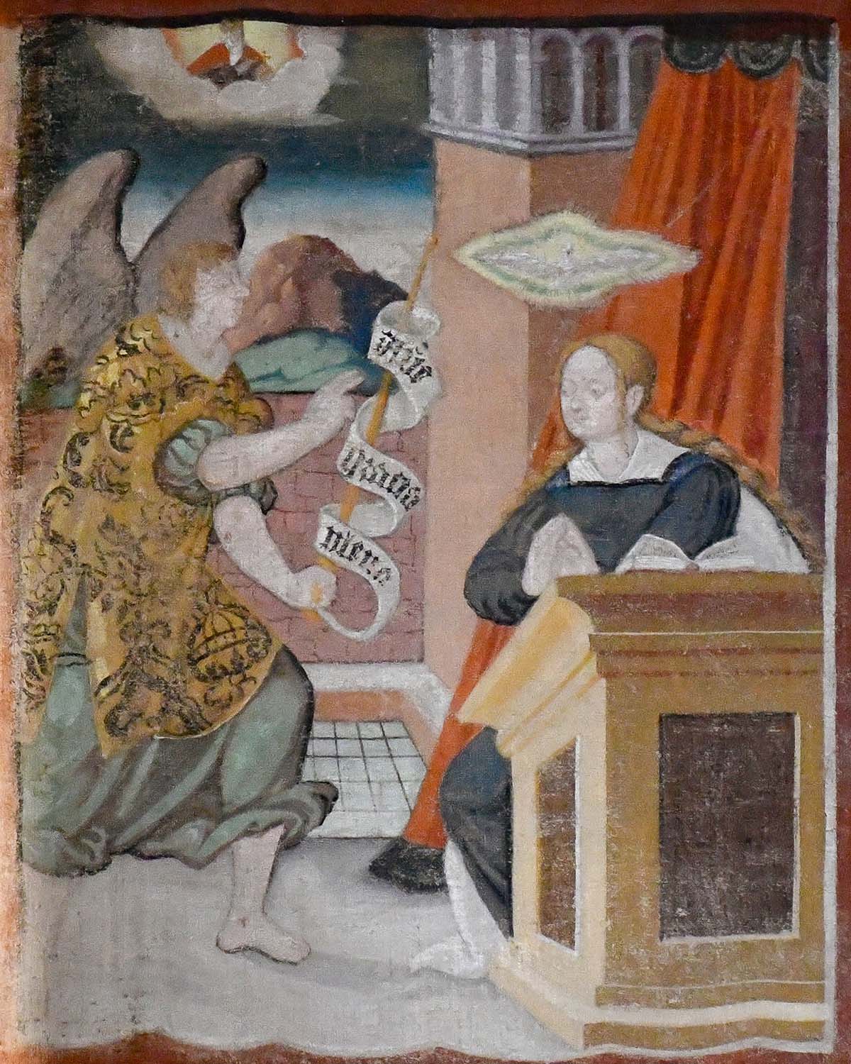 Auf der linken Seite nähert sich der Erzengel Gabriel in einem prachtvollen, goldgemusterten Gewand und überbringt die göttliche Botschaft mithilfe einer kunstvoll geschwungenen Banderole mit der Aufschrift „Ave Maria…“. Maria ist auf der rechten Seite an einem hölzernen Betpult mit einem aufgeschlagenen Buch dargestellt, während über ihr der Heilige Geist in Gestalt einer Taube in einer leuchtenden Aura erscheint. Die Szene ist durch architektonische Details wie eine Säule und einen schweren roten Vorhang sowie einen Ausblick in eine Landschaft im Hintergrund gerahmt.