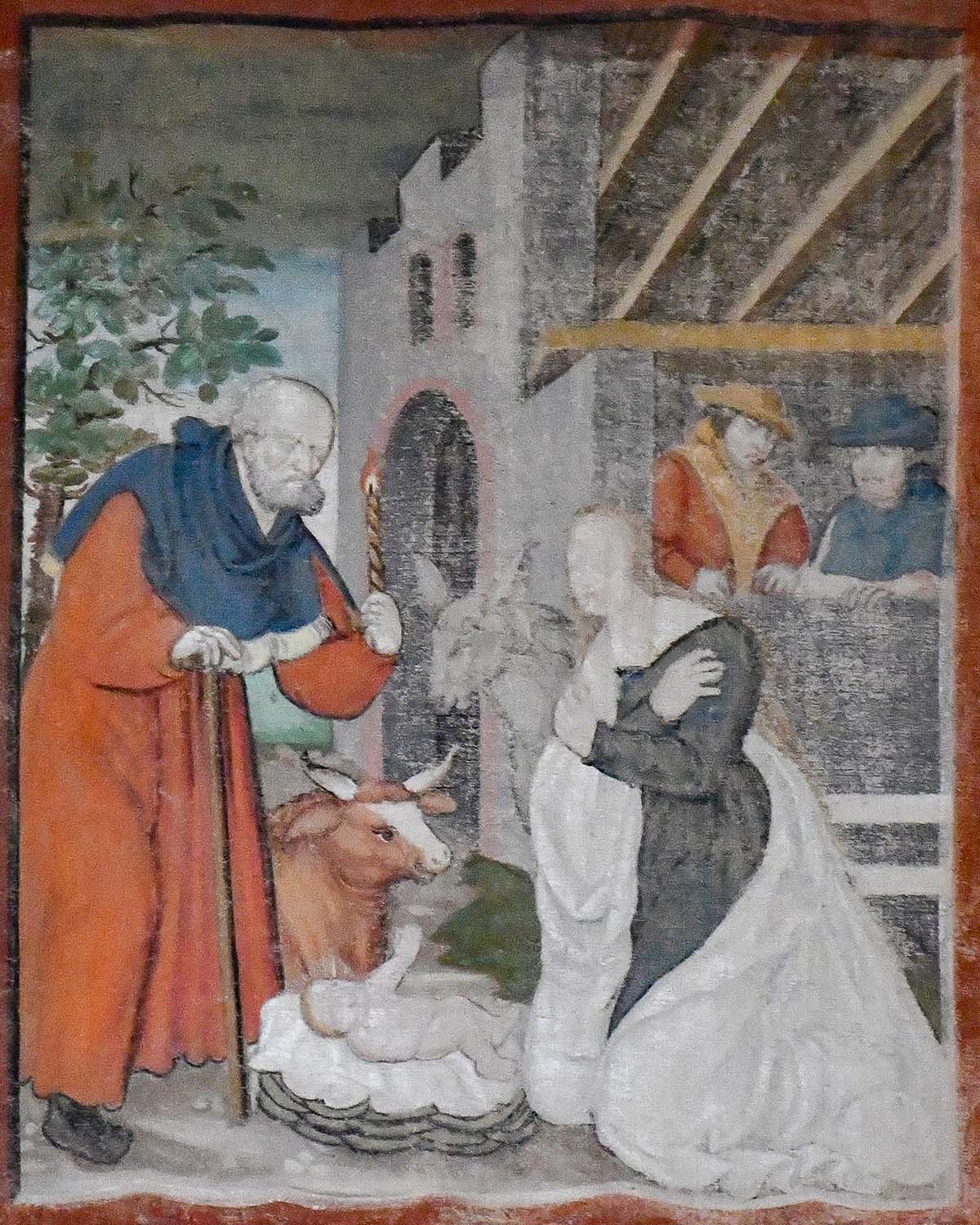 Im Zentrum der Darstellung kniet Maria in einem dunklen Kleid mit hellem Mantel anbetend vor dem Jesuskind, das in einer Krippe auf einem weißen Tuch liegt. Links flankiert Joseph die Szene, dargestellt als älterer Mann mit Stab und einer brennenden Kerze, während im Hintergrund Ochse und Esel sowie zwei weitere Figuren, die über eine Mauer in den Stall blicken, zu erkennen sind.