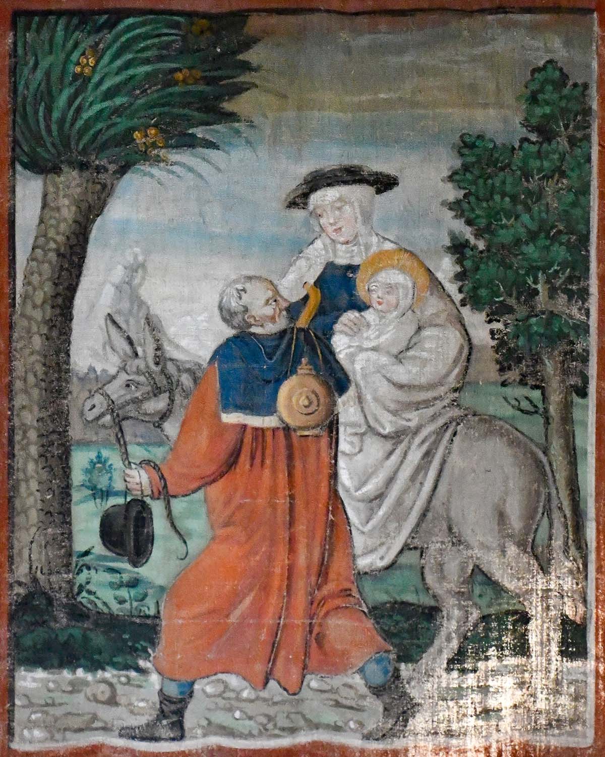 Im Zentrum der Darstellung führt Joseph, bekleidet mit einem roten Gewand und einem blauen Schulterumhang, einen Esel an einem Strick, während er seinen Hut in der rechten Hand trägt. Auf dem Esel sitzt Maria, die das in ein helles Tuch gewickelte Jesuskind schützend im Arm hält. Die Szene ist in einer Landschaft mit verschiedenen Bäumen angesiedelt, wobei links eine markante Palme mit Früchten zu sehen ist.