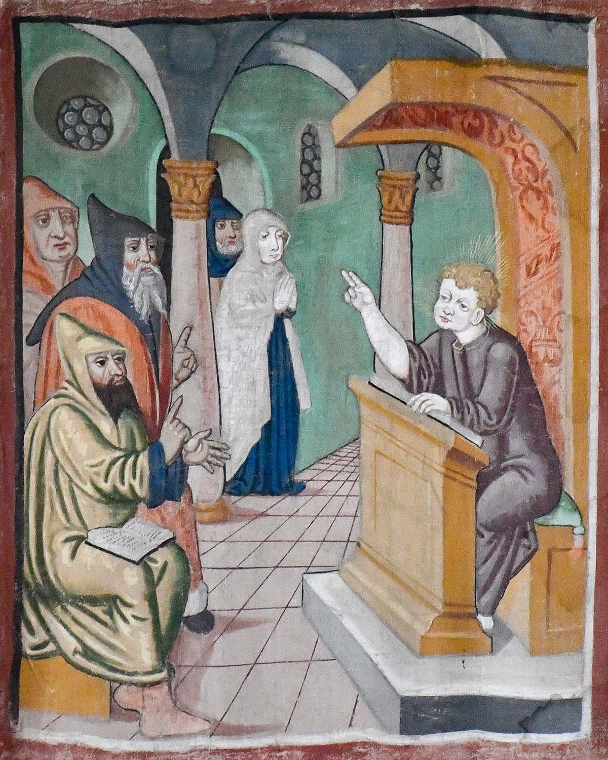 Im rechten Bilddrittel sitzt der junge, lockenköpfige Jesus unter einem Baldachin an einem hölzernen Pult und gestikuliert lehrend mit erhobener Hand. Ihm gegenüber sitzt eine Gruppe von Gelehrten, die zum Teil in Büchern lesen oder in eine angeregte Diskussion mit dem Knaben vertieft sind. Im Hintergrund betreten Maria und Joseph den Raum, wobei Maria in einer anbetenden oder staunenden Haltung mit gefalteten Händen dargestellt ist. Die Szene ist in einem architektonischen Innenraum mit Säulen und gewölbter Decke angesiedelt.
