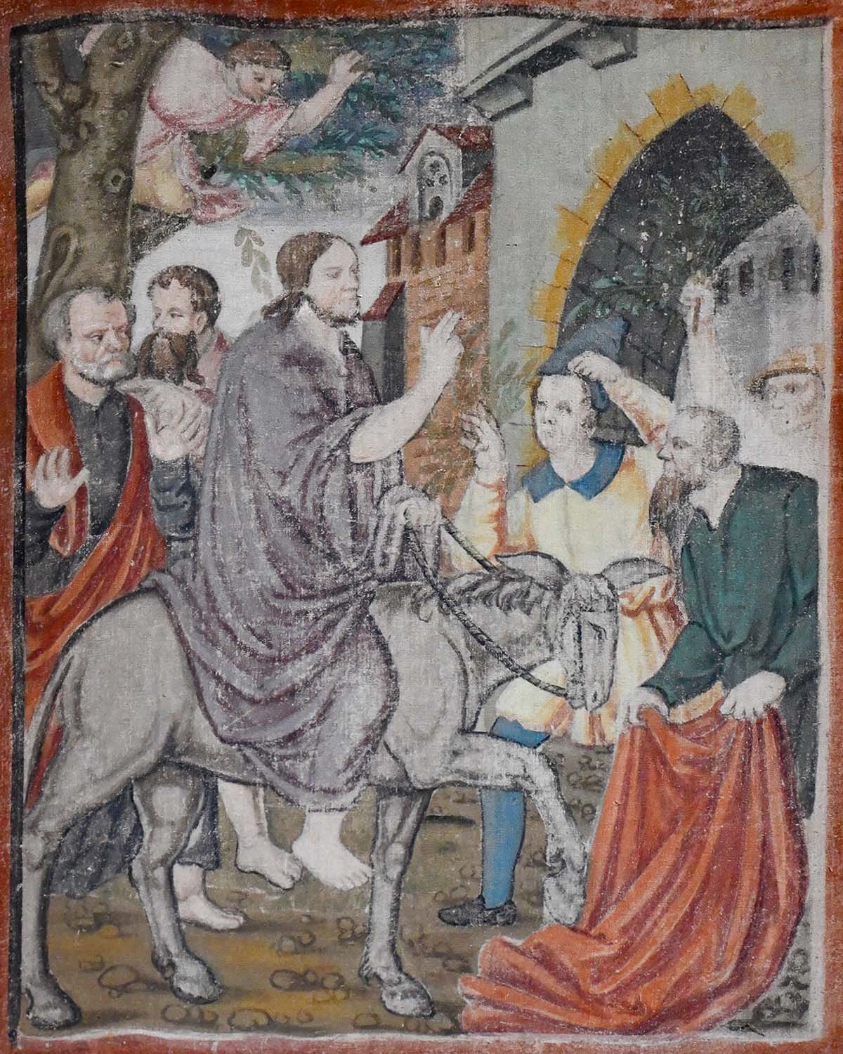 Im Mittelpunkt der Darstellung reitet Jesus auf einem Esel und erhebt die rechte Hand zum Segensgestus. Er wird von Jüngern begleitet, während ihm zur Begrüßung ein rotes Gewand auf den Weg gebreitet wird. Am linken oberen Bildrand ist eine Person in einem Baum zu erkennen, die das Geschehen verfolgt, während im Hintergrund das Stadttor von Jerusalem angedeutet ist.