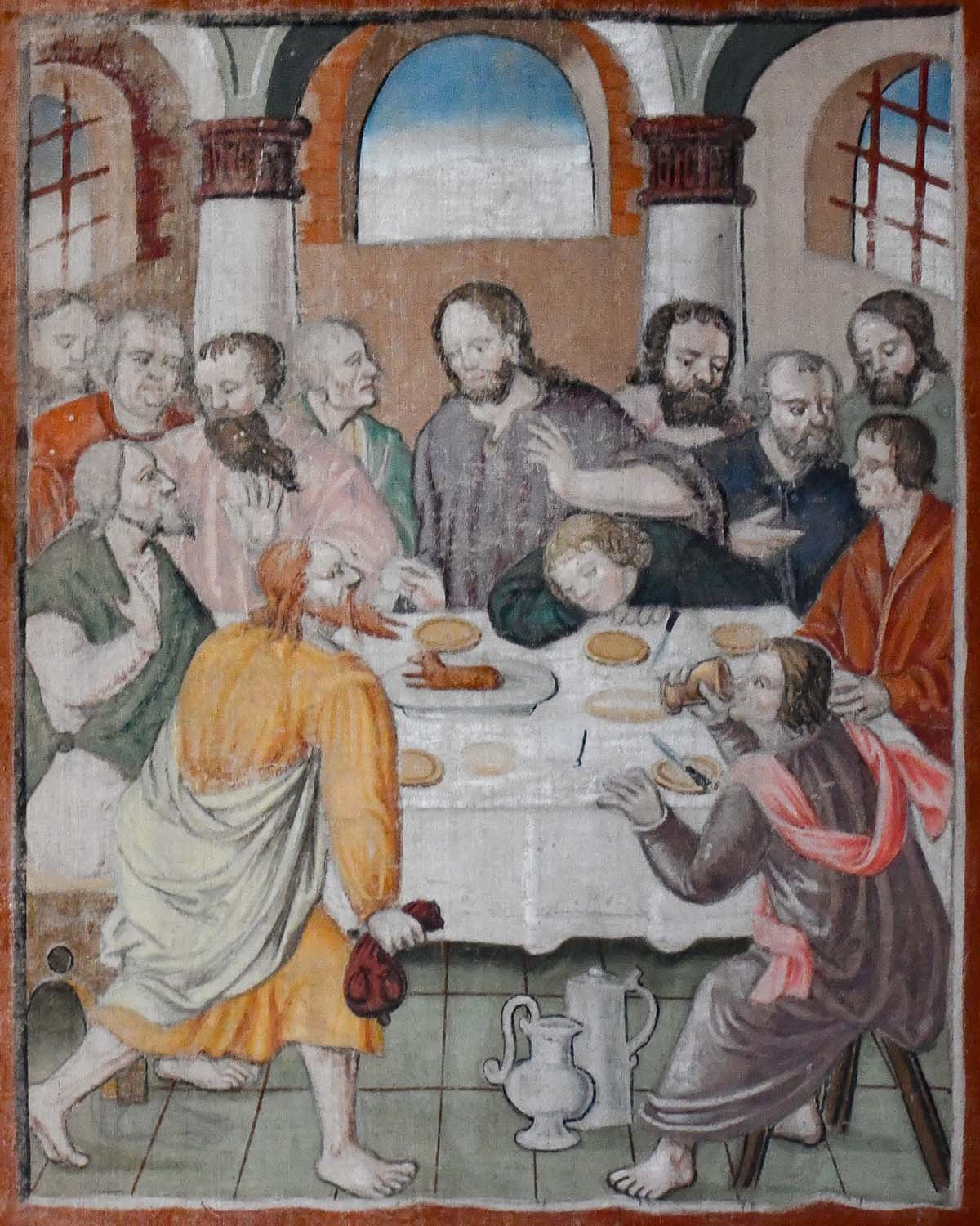 Besonders markant sind zwei Figuren: Der Jünger Johannes, der seinen Kopf schlafend an Jesu Seite neigt, sowie Judas im Vordergrund, der – erkennbar an seinem rötlichen Haar und dem Geldbeutel in seiner Hand – die Szene zu verlassen scheint. Die Handlung ist in einem Innenraum mit Säulen und Rundbogenfenstern angesiedelt, wobei im Vordergrund große Krüge auf dem Fliesenboden stehen.