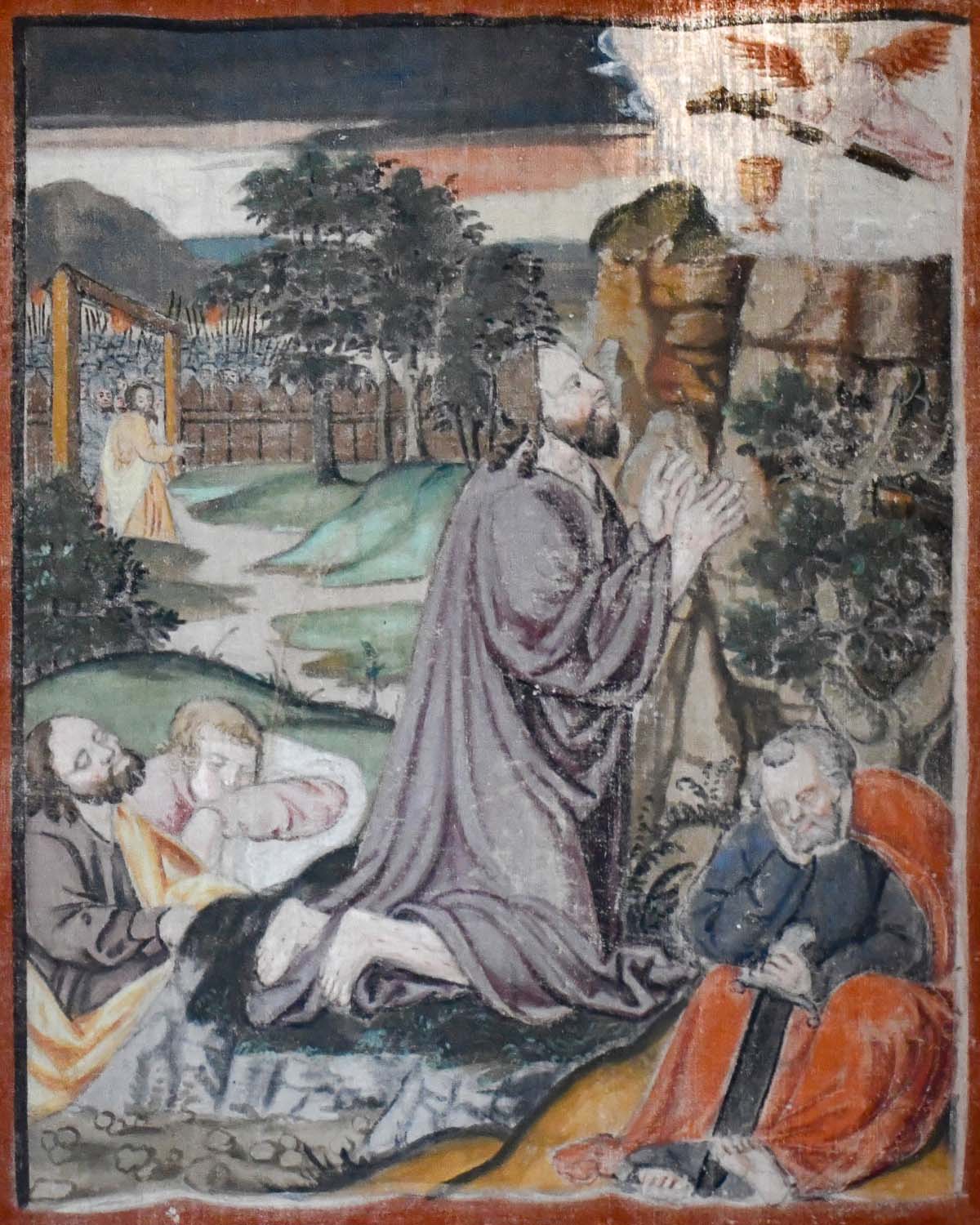 Im Zentrum kniet Jesus im Gebet, den Blick nach rechts oben gerichtet, wo in einer himmlischen Erscheinung ein Engel mit einem Kelch – dem Symbol seines bevorstehenden Leidens – erscheint. Im Vordergrund sind die drei Jünger Petrus, Jakobus und Johannes im tiefen Schlaf dargestellt, wobei Petrus auf der rechten Seite an seinem Schwert erkennbar ist. Währenddessen nähert sich im linken Hintergrund bereits die Gruppe der Häscher, angeführt von Judas, um Jesus gefangen zu nehmen.