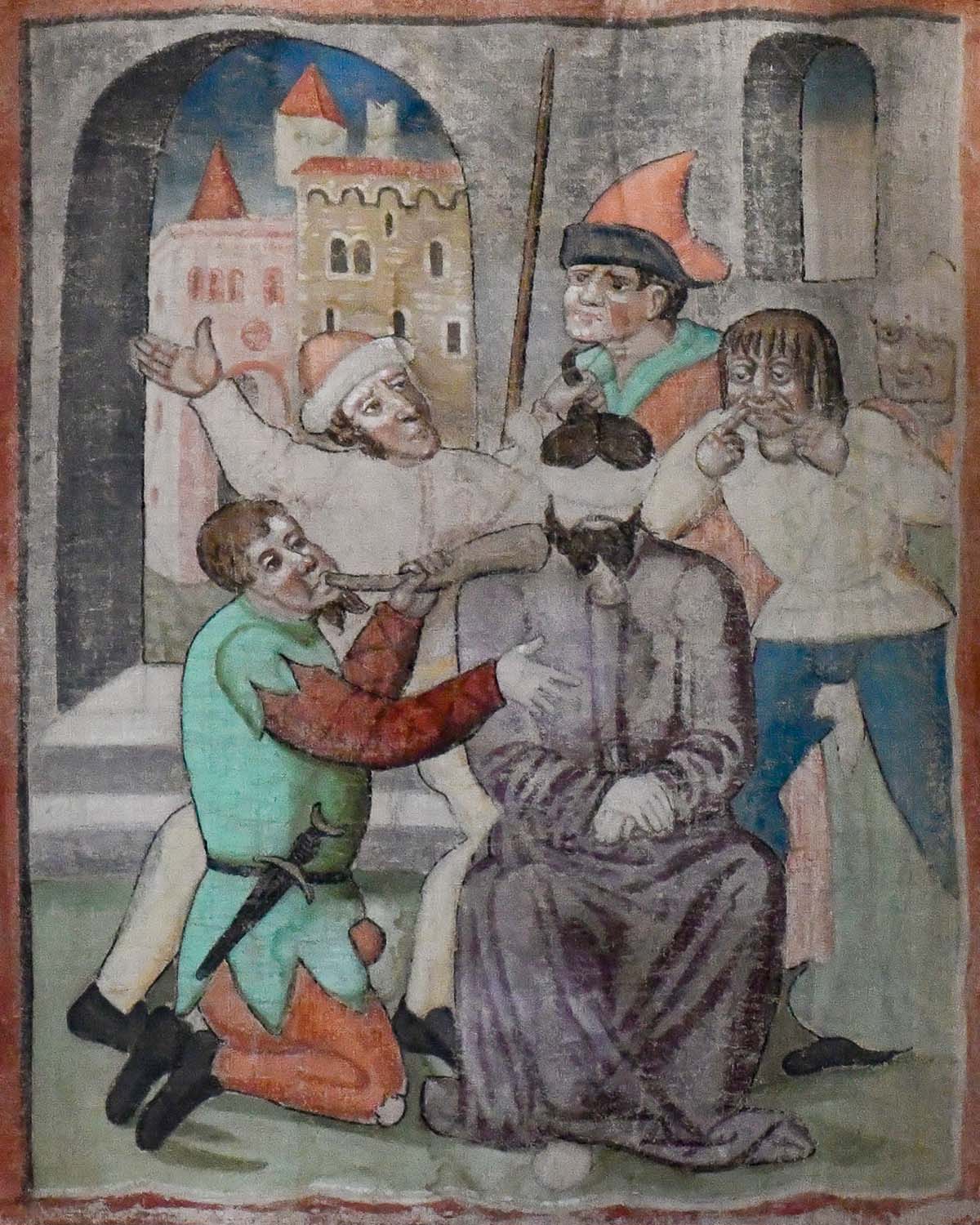 Im Zentrum der Darstellung sitzt Jesus mit verbundenen Augen, während er von mehreren Männern auf grausame Weise verhöhnt wird: Ein Knecht im grün-roten Gewand bläst ihm mit einem Horn direkt ins Ohr, ein anderer schneidet Grimassen, und im Hintergrund ist eine Figur mit einer markanten roten Zipfelmütze zu sehen. Die Szene ist in einem Innenraum mit einem Rundbogen angesiedelt, der den Blick auf eine Stadt mit Türmen im Hintergrund freigibt.