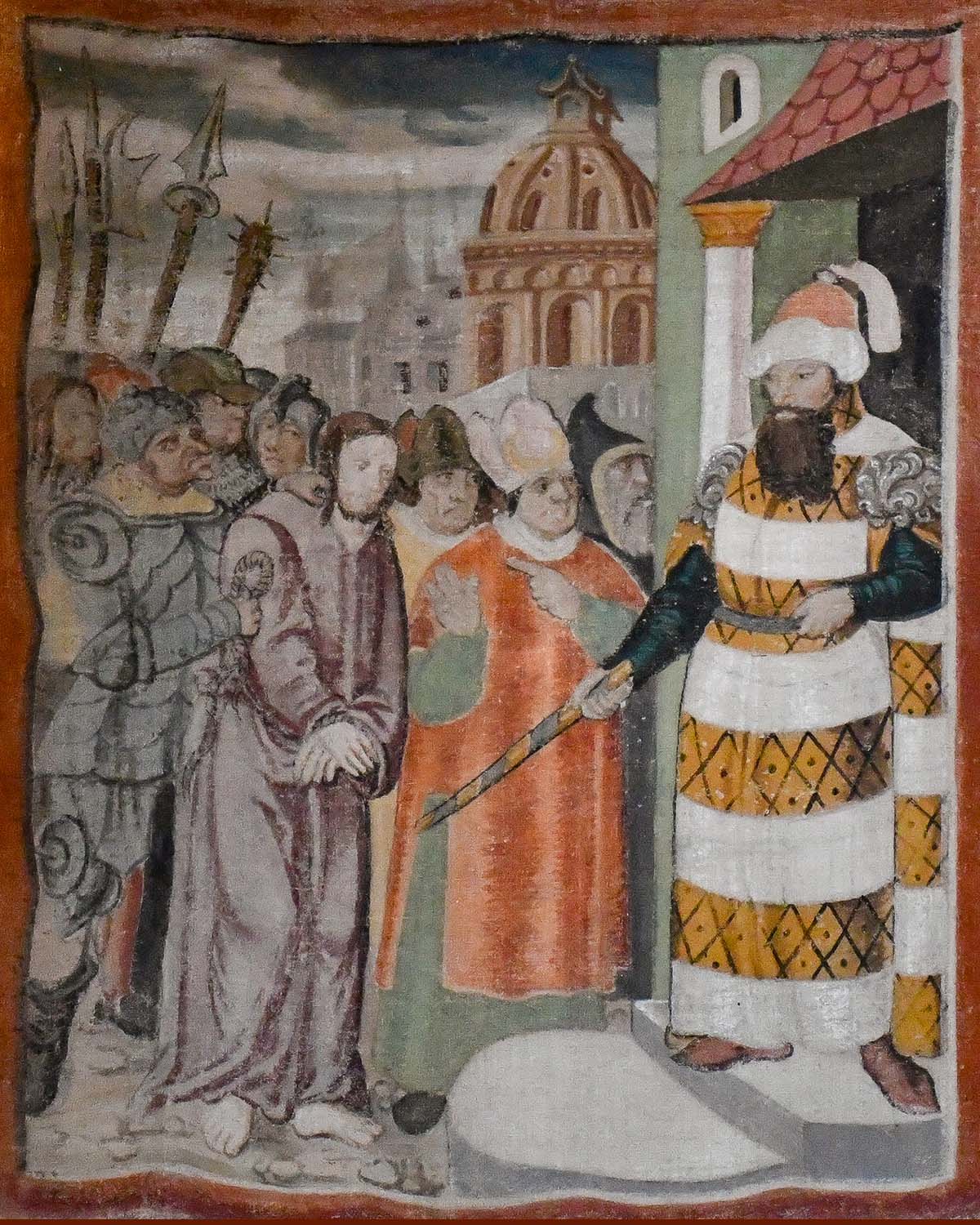 Im linken Bildteil wird Jesus mit gebundenen Händen in einem violetten Gewand von einer Gruppe bewaffneter Soldaten mit Hellebarden und Spießen vorgeführt. Auf der rechten Seite, erhöht auf einer Stufe unter einem kleinen Säulenvorbau stehend, ist Pontius Pilatus dargestellt; er trägt eine markante, turbanartige Kopfbedeckung sowie ein auffällig gestreiftes Gewand und hält einen Stab in der Hand. Im Hintergrund der Szene ist eine städtische Architektur mit einer großen Kuppel zu erkennen.