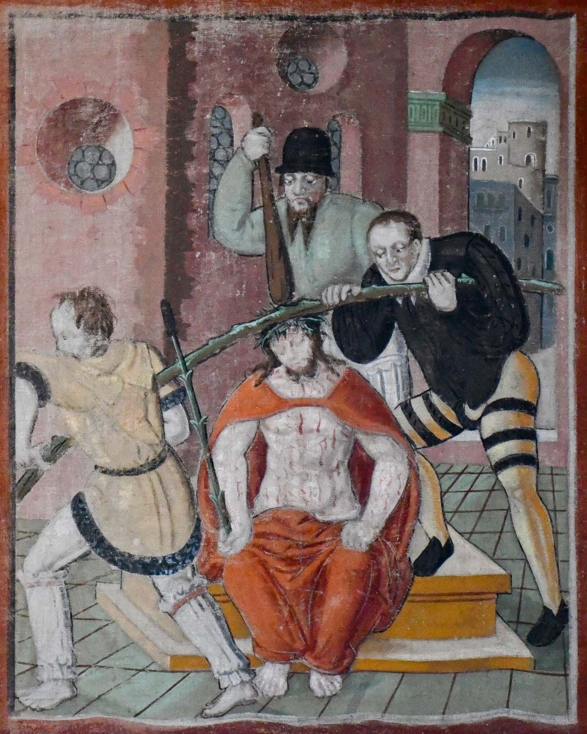 Im Zentrum der Darstellung sitzt Jesus auf einer gelblichen Stufe, bekleidet mit einem leuchtend roten Mantel, wobei auf seinem entblößten Oberkörper die Spuren der Geißelung sichtbar sind. Drei Männer umgeben ihn, von denen zwei lange Stäbe benutzen, um die Dornenkrone schmerzhaft auf sein Haupt zu drücken. Die Szene ist in einem Innenraum mit Rundbogenfenstern angesiedelt, der auf der rechten Seite den Blick auf eine städtische Architektur im Hintergrund freigibt.