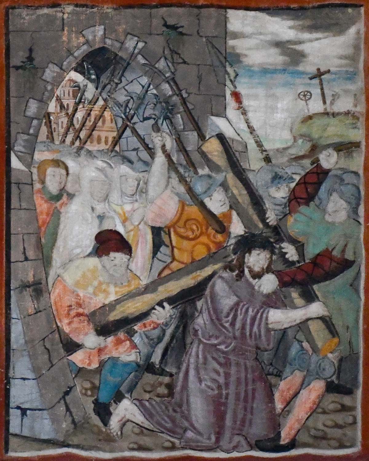 Im Zentrum der Darstellung ist Jesus zu sehen, der unter der Last des großen Holzkreuzes zusammenbricht, während er von einer Gruppe bewaffneter Soldaten mit Speeren und Hellebarden aus einem Stadttor getrieben wird. Ein Mann in auffällig gemustertem Gewand scheint ihm das Kreuz aufzubürden oder ihn voranzutreiben, während im linken Hintergrund die klagenden Frauen folgen. In der Ferne, am rechten oberen Bildrand, ist bereits der Hügel Golgotha mit den drei Kreuzen als Ziel des Leidensweges angedeutet.