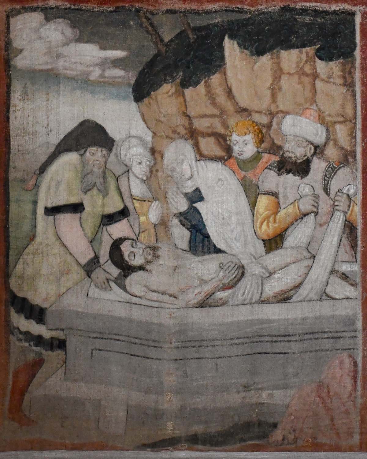 Im Zentrum der Darstellung wird der Leichnam Jesu von seinen Getreuen behutsam in einen steinernen Sarkophag gebettet. Ein Helfer auf der linken Seite stützt den Oberkörper des Verstorbenen, während auf der rechten Seite ein bärtiger Mann mit heller, turbanartiger Kopfbedeckung das weiße Leichentuch an den Füßen hält. In der Mitte der Gruppe ist die trauernde Maria mit weißem Schleier und gefalteten Händen zu sehen, umgeben von weiteren Begleitern vor einer felsigen Hintergrundkulisse.