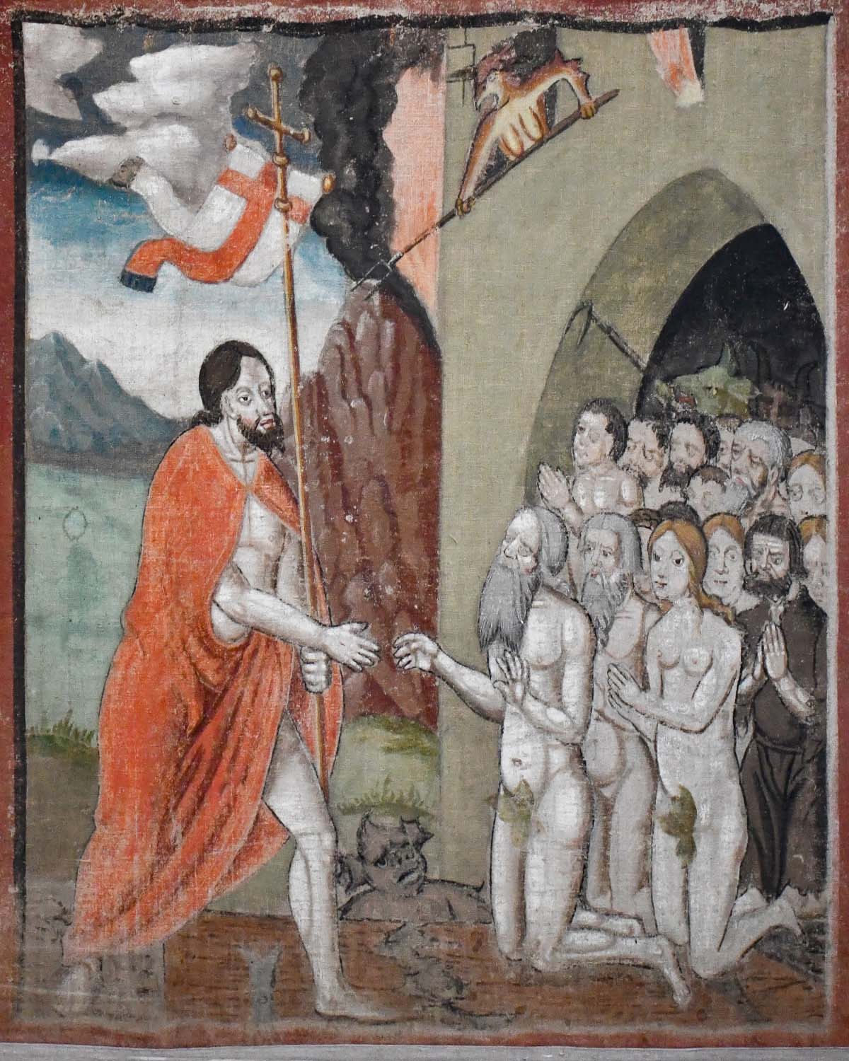 Im linken Bildteil steht Jesus, bekleidet mit einem roten Mantel, und hält den Kreuzstab mit der weiß-roten Siegfahne in der Hand. Er reicht seine Hand einer Gruppe von nackten Seelen entgegen, die in einem bogenförmigen Höhleneingang knien und auf ihre Erlösung warten. Besonders markant ist der bärtige Mann im Vordergrund, der Jesus ehrfürchtig entgegenblickt. Über dem Eingang ist eine kleine dämonische Gestalt zu erkennen, während im Hintergrund dunkler Rauch aufsteigt.
