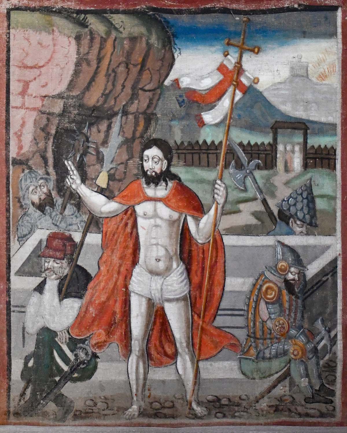 Im Zentrum der Darstellung steht der auferstandene Jesus vor dem offenen, steinernen Sarkophag. Er ist mit einem weißen Lendentuch und einem leuchtend roten Mantel bekleidet und hält in der linken Hand den Kreuzstab mit der weiß-roten Siegfahne, während er die rechte Hand zum Segensgestus erhebt. Um das Grab herum sind die Wächter in zeitgenössischen Rüstungen und Gewändern dargestellt, die vom göttlichen Wunder völlig überwältigt scheinen oder in tiefem Schlaf verharren. Im Hintergrund ist eine hügelige Landschaft mit einem Zaun und einem Gebäude in der Ferne angedeutet.