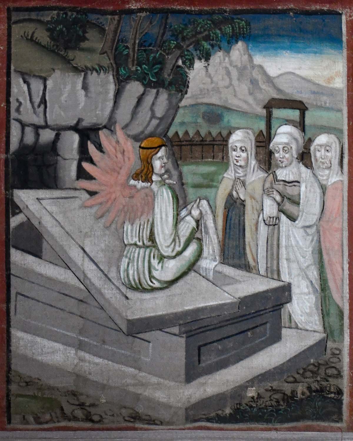 Im Zentrum der Darstellung sitzt ein Engel mit rötlichen Flügeln auf dem Rand des geöffneten, steinernen Sarkophags und weist auf das leere Grab hin. Ihm gegenüber stehen drei Frauen in ehrfürchtiger Haltung, die Salbgefäße für den Leichnam Jesu in den Händen tragen. Die Szene ist in eine Landschaft mit einer felsigen Höhlenöffnung, einem Holzzaun und Bergen im Hintergrund eingebettet.