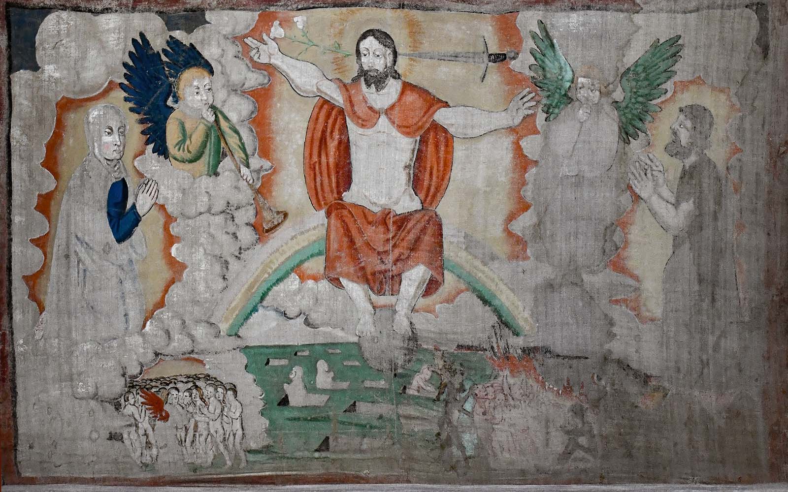 Im Zentrum thront Christus als Weltenrichter auf einem Regenbogen, wobei eine Lilie als Symbol der Gnade und ein Schwert als Symbol der Gerechtigkeit von seinem Haupt ausgehen. Er wird von der bittenden Maria (links) und Johannes dem Täufer (rechts) sowie Engeln mit Posaunen flankiert. Im unteren Bildteil ist die Auferstehung der Toten zu sehen: Während die Seligen auf der linken Seite zum Himmel geführt werden, werden die Verdammten auf der rechten Seite von Teufelsgestalten in das Höllenfeuer getrieben.