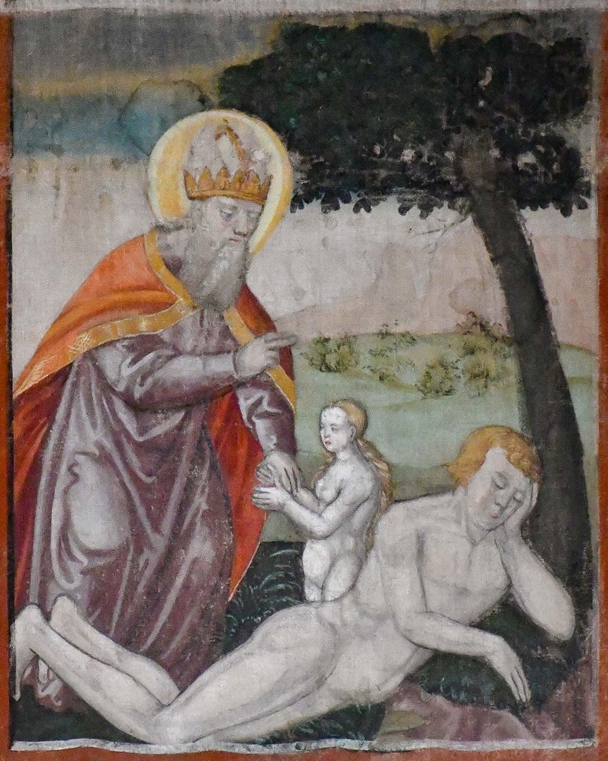 Im Vordergrund liegt Adam im tiefen Schlaf auf der Erde, während Gottvater – erneut dargestellt mit Krone, Heiligenschein und weitem roten Mantel – die Eva aus Adams Seite hervorgehen lässt. Gottvater hält dabei Evas Hände in einer segnenden oder leitenden Geste. Die Szene ist in einer schlichten Landschaft mit einem markanten Baum im Hintergrund angesiedelt. Die Szene illustriert die Fortsetzung der Heilsgeschichte unmittelbar nach der Erschaffung der Welt.