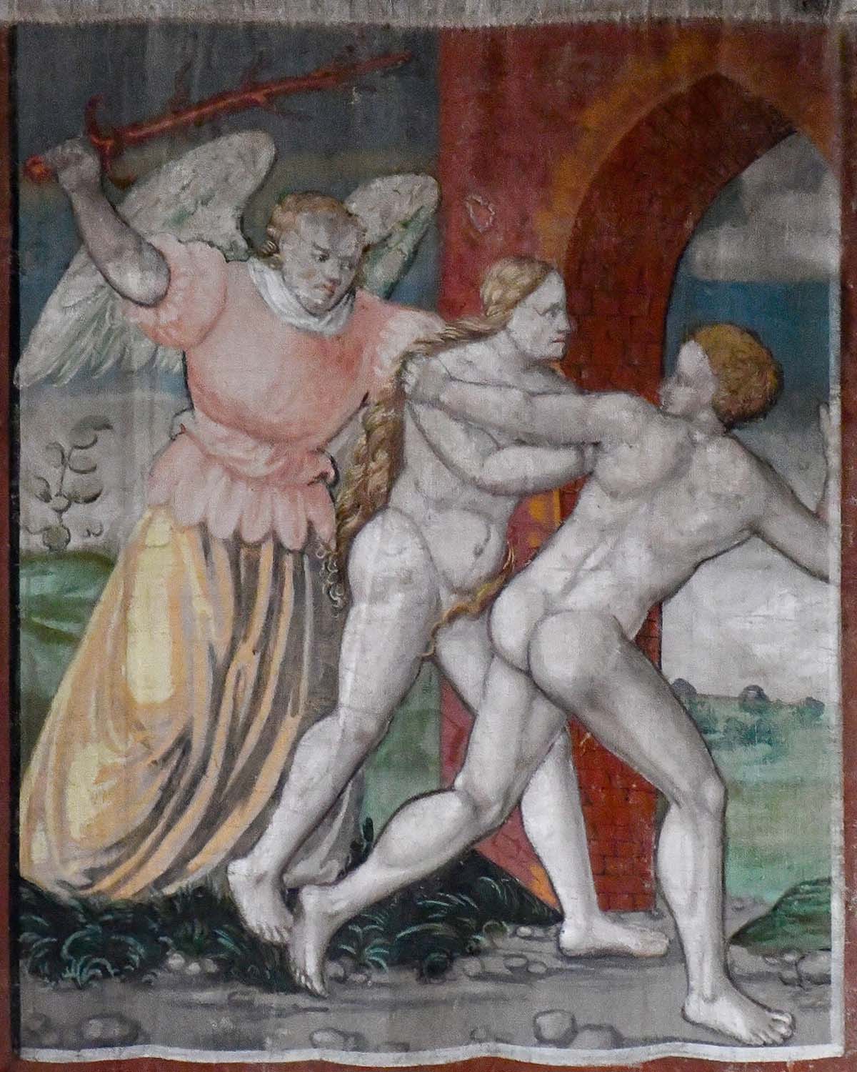 Ein Engel mit großen Flügeln, gekleidet in ein rosa Obergewand und einen gelben Rock, schwingt ein rotes Flammenschwert und drängt die nackten Figuren von Adam und Eva durch ein bogenförmiges Portal nach draußen. Im Hintergrund öffnet sich eine schlichte Landschaft mit grünen Hügeln unter einem bewölkten Himmel, in die das erste Menschenpaar nun verstoßen wird.