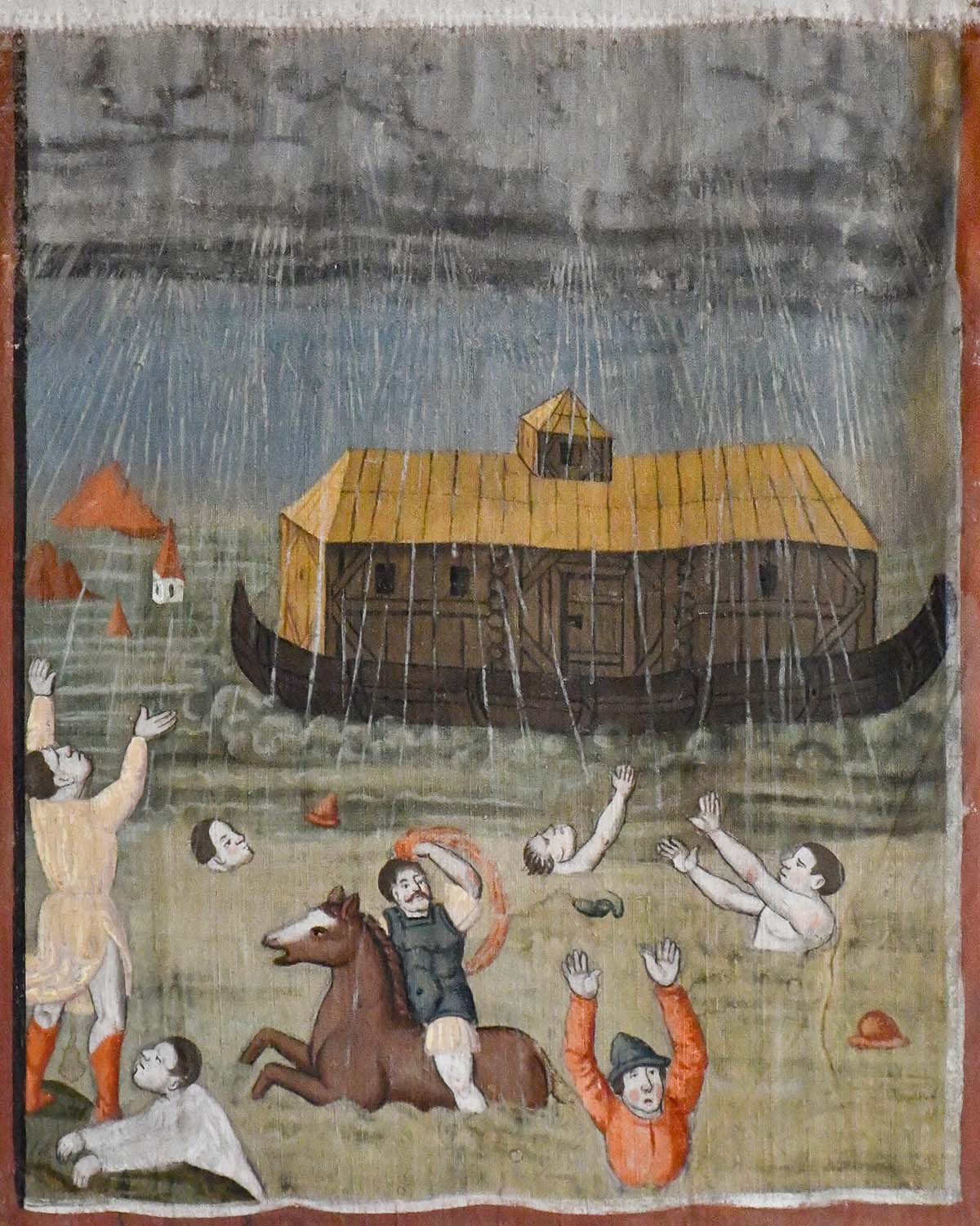 Dieses Bild zeigt die Arche Noah, die sechste Szene aus dem alttestamentlichen Zyklus des Baldramsdorfer Fastentuches. Inmitten der Fluten der Sintflut ist das hölzerne, hausartige Schiff dargestellt, das Noah, seiner Familie und den Tieren als Zufluchtsort dient. Die Gestaltung der Szenen auf dem Tuch orientiert sich dabei vielfach an grafischen Vorbildern berühmter Meister wie Albrecht Dürer oder Lukas Cranach.