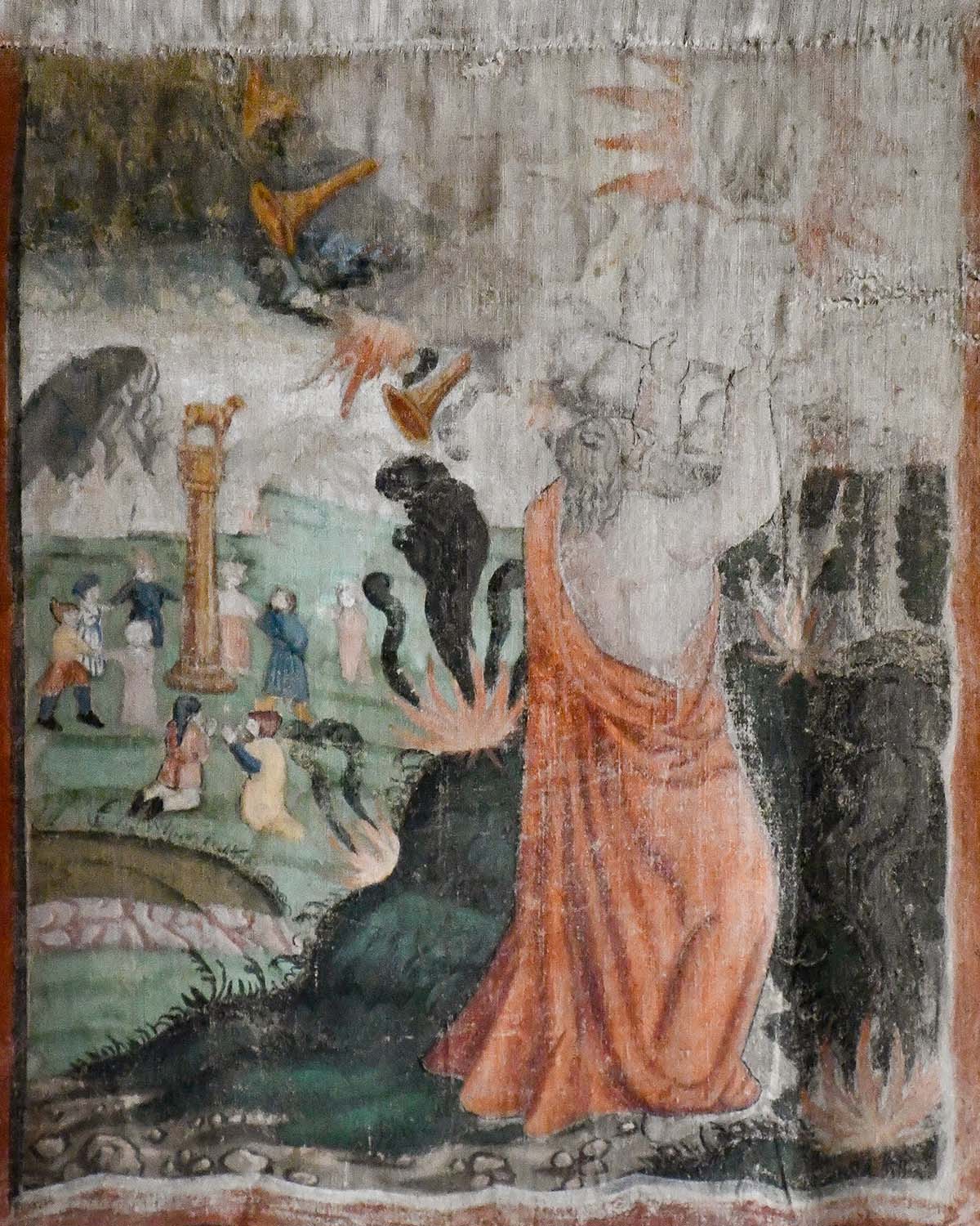 Dieses Bild zeigt das Weltgericht, die abschließende Darstellung aus dem Zyklus des Baldramsdorfer Fastentuches, welche als einziges Motiv ein Doppelfeld in der untersten Reihe einnimmt,.
