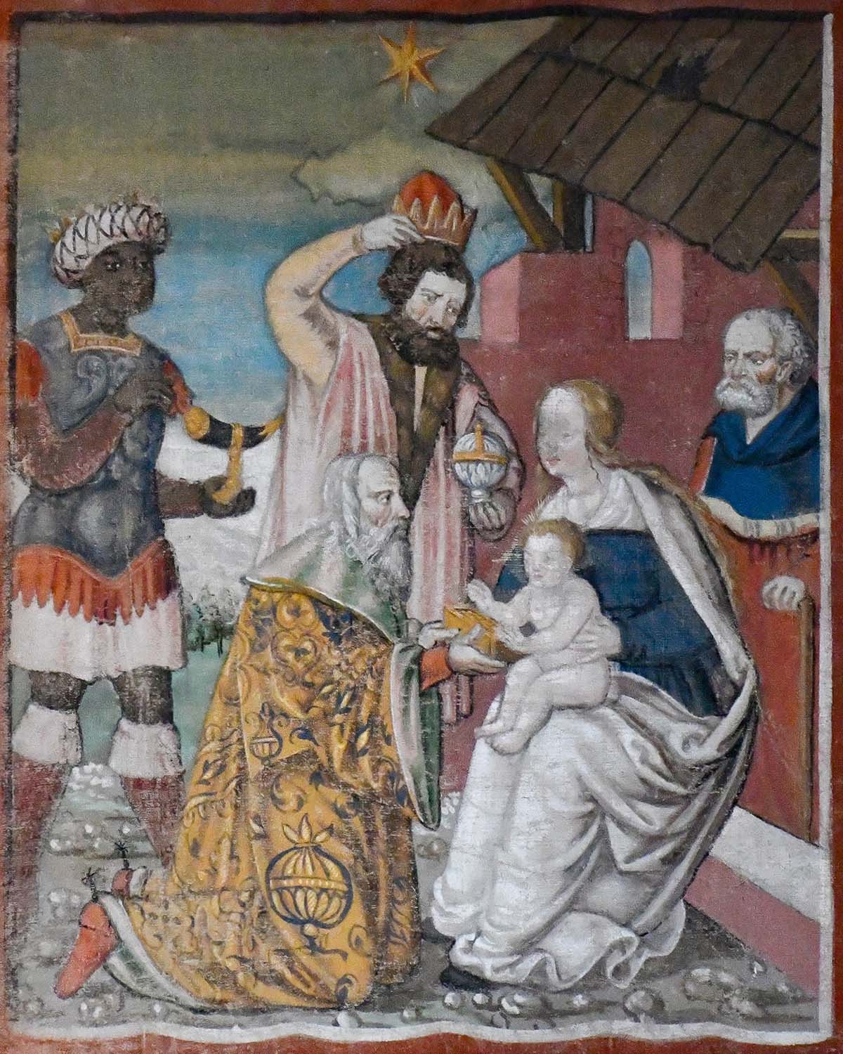 Im Zentrum der Darstellung sitzt Maria mit dem nackten Jesuskind auf dem Schoß, während Josef im Hintergrund hinter einer Mauer das Geschehen beobachtet. Vor ihnen kniet einer der Weisen in einem prachtvoll gemusterten, goldfarbenen Gewand und überreicht seine Gabe, während ein zweiter König stehend seine Krone lüftet. Am linken Bildrand ist der dritte König als Mohr in einer antikisierenden Rüstung mit Turban dargestellt. Über der Szene, die vor einer schlichten Stallarchitektur angesiedelt ist, leuchtet der Stern von Bethlehem am Himmel.