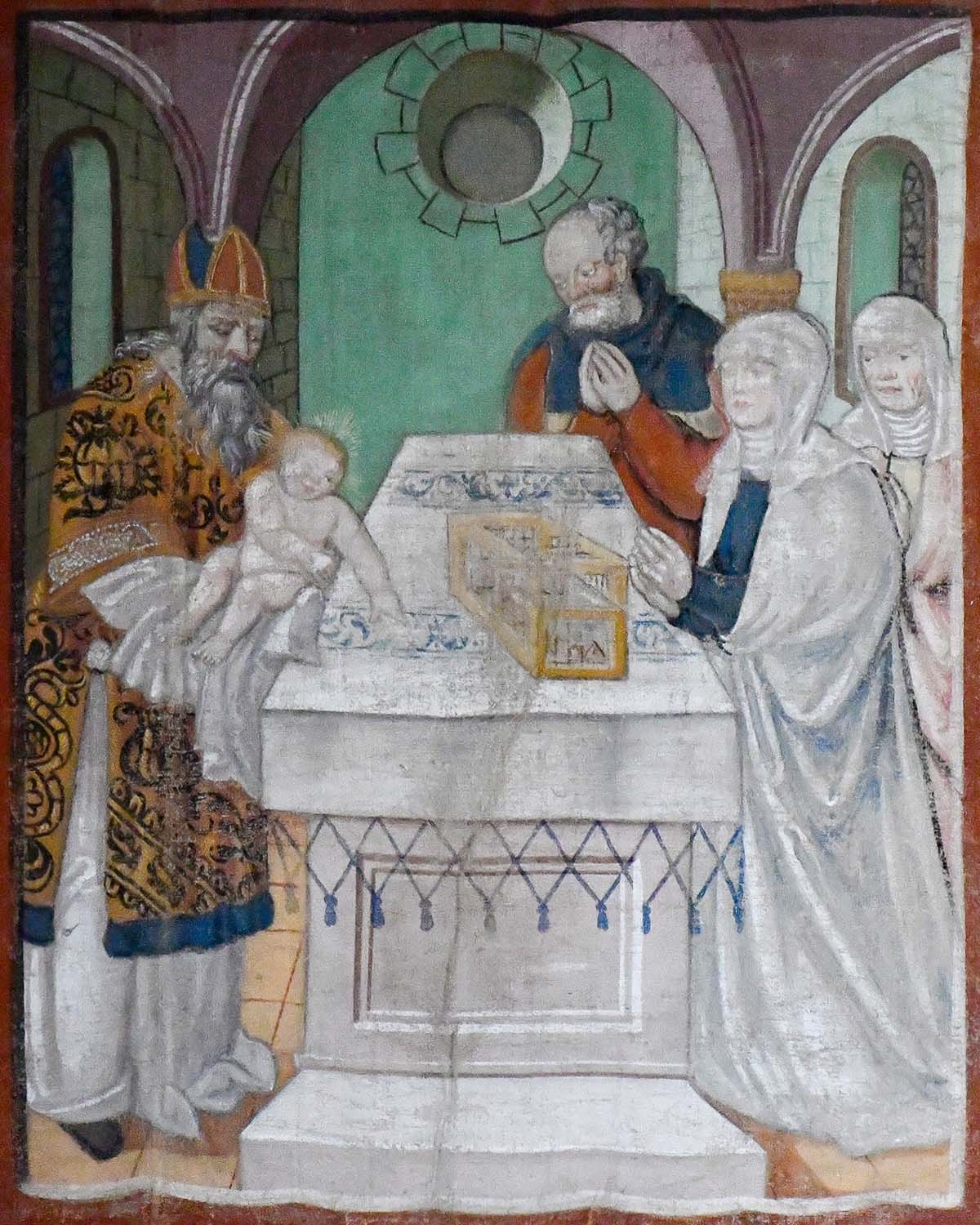 Auf der linken Seite hält der greise Simeon, dargestellt als hoher Priester in einem prachtvoll gemusterten Goldgewand und mit einer Mitra, das nackte Jesuskind über einem weißen Altar. Rechts steht Maria in einem weißen Schleiergewand mit gefalteten Händen, während im Hintergrund Joseph betend und eine weitere weibliche Figur am Geschehen teilnehmen. Die Szene ist in einem architektonischen Rahmen mit Rundbögen und einem kreisrunden Fenster angesiedelt.