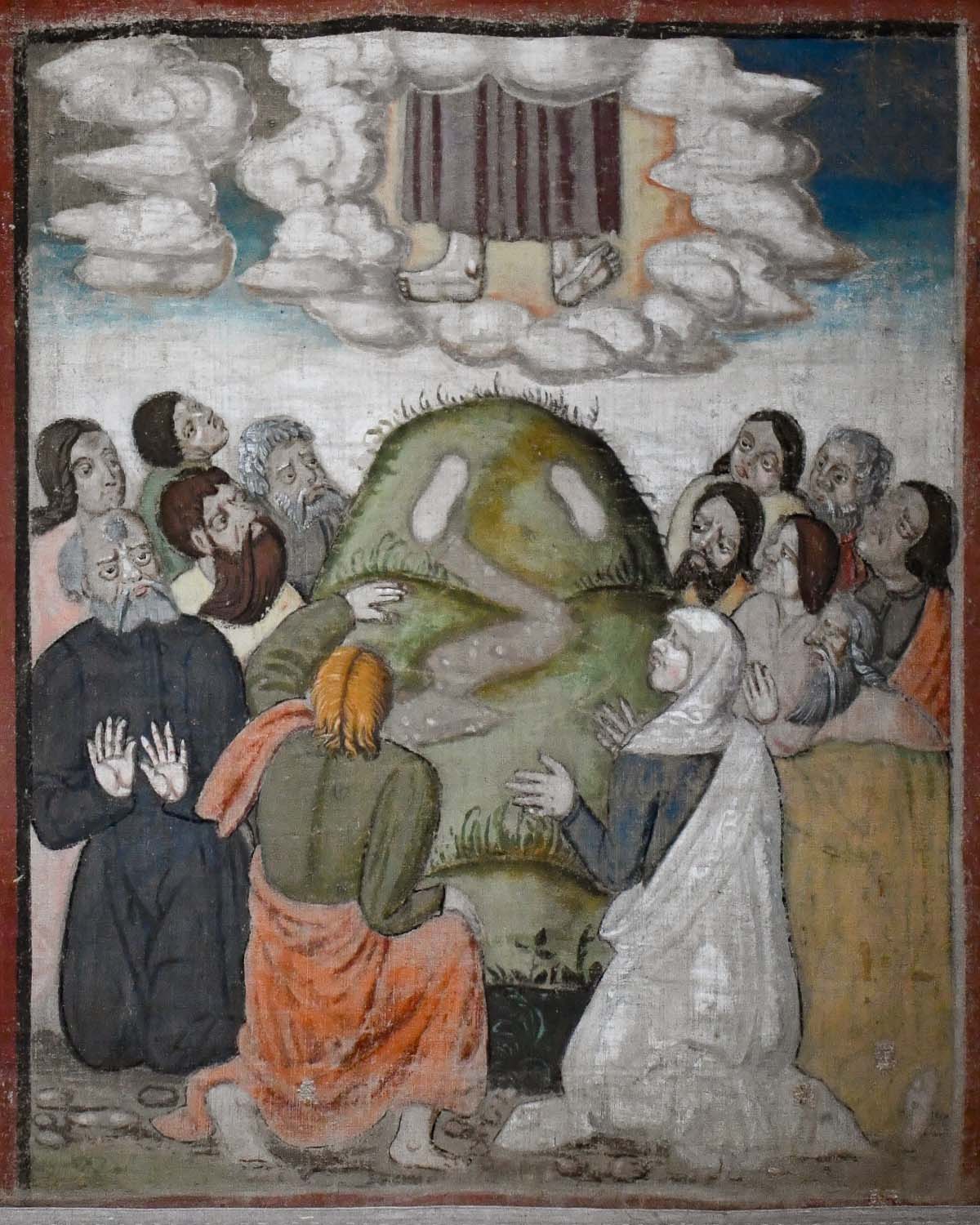 In einer für die damalige Zeit charakteristischen Darstellungsweise sind am oberen Bildrand nur noch die Füße und der untere Teil des Gewandes Jesu zu sehen, während er in einer hellen Wolke zum Himmel emporgehoben wird. Auf dem grünen Hügel in der Bildmitte bleiben seine Fußabdrücke als sichtbares Zeichen seines Wirkens auf Erden zurück. Um den Berg herum hat sich eine Gruppe von Menschen versammelt, darunter Maria und die Jünger, die mit zum Himmel gerichteten Blicken und bittenden oder staunenden Gesten dem Geschehen beiwohnen.