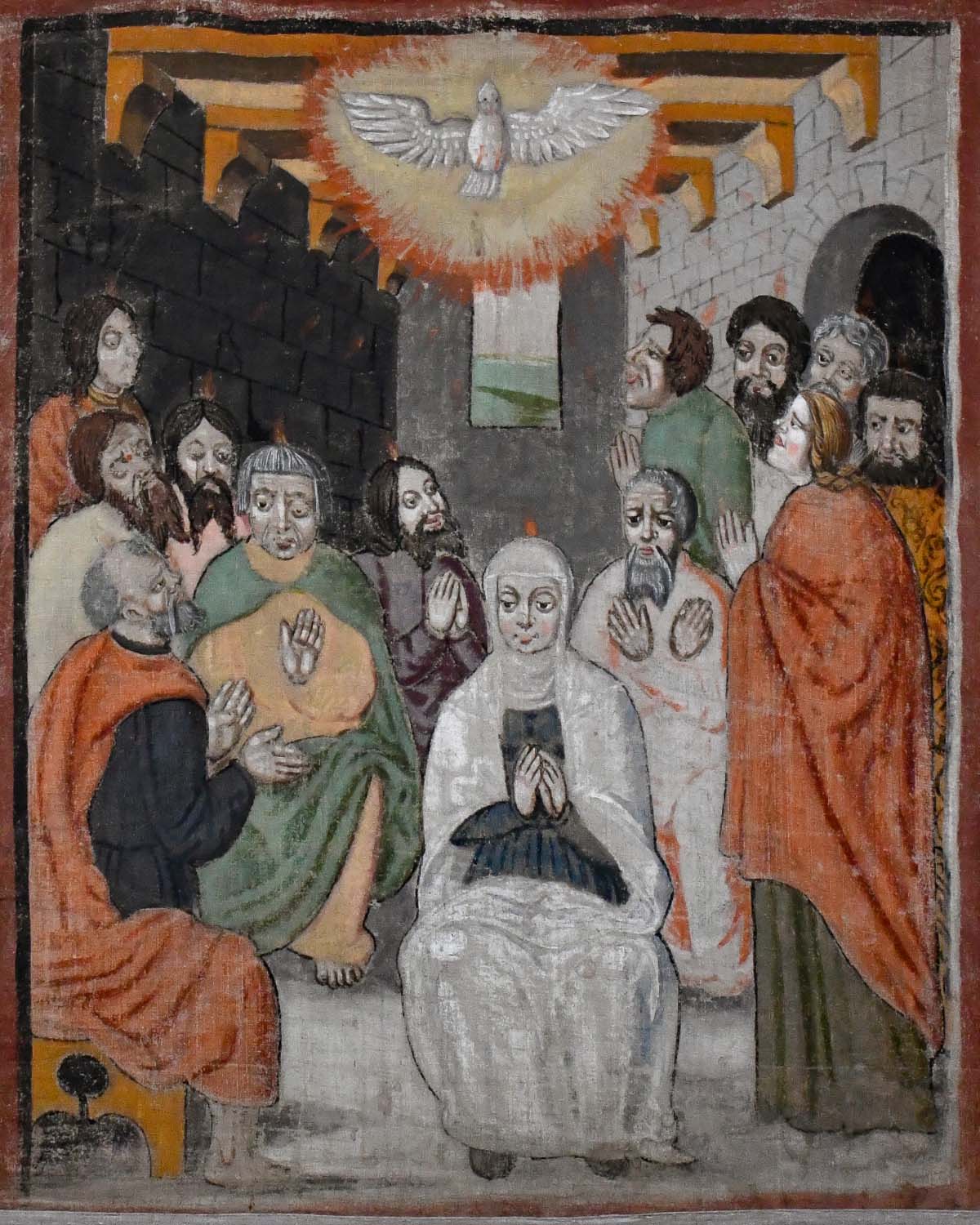 Dieses Bild zeigt das Pfingstfest. Inmitten der Apostel ist die Jungfrau Maria dargestellt, während der Heilige Geist in Gestalt einer Taube aus einer hellen Wolke am oberen Bildrand herabsteigt. Die Figuren sind in einem architektonischen Raum mit Rundbögen versammelt und blicken ehrfürchtig oder mit staunenden Gesten zum Himmel empor.